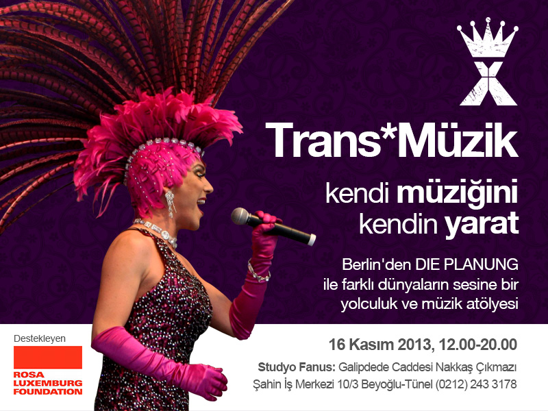 Trans*Müzik Atölyesi LGBTI bireyler ve Almanyalı DIE PLANUNG müzik grubu. Ses kompoziyonu, oturum ve kayıt. Tüm katılımcılar atölye sonunda CD alacaklar. Studyo Fanus Tunel: Galipdede Cad. Nakkaş Çıkmazı Şahin İş Merkezi 10/3 Beyoğlu-Tünel |